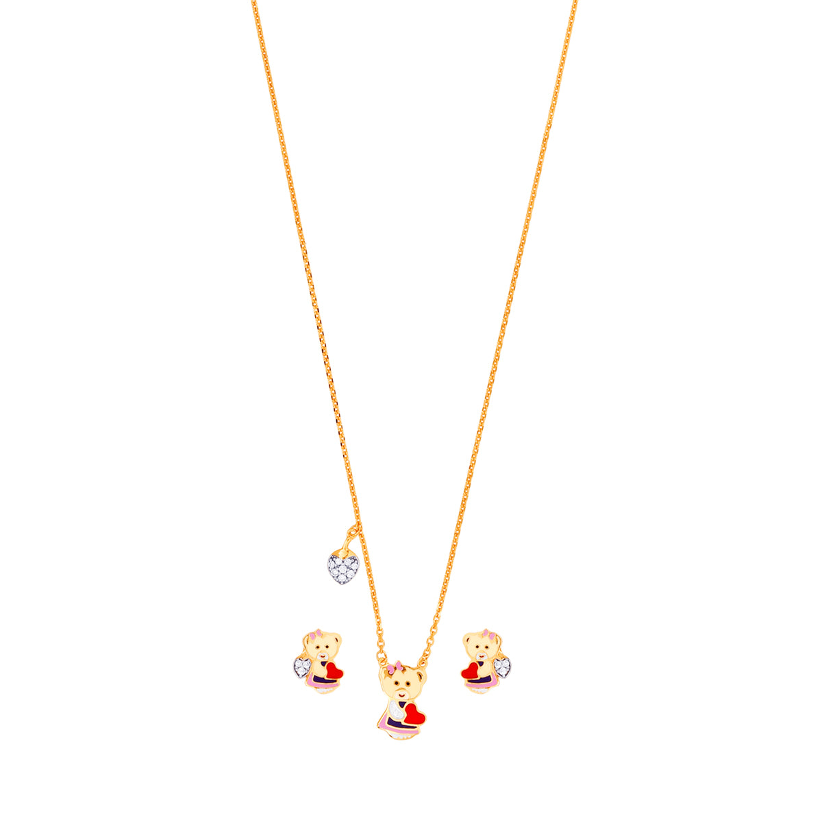 Discover the enchanting world of elegance with the Kids Minakari Necklace Set with CZ in 22K Gold by Malani Jeweler. Crafted for young style enthusiasts this exquisite set combines high-quality 22KT yellow gold with the vibrant artistry of Minakari finish. Perfect for special occasions the set includes a charming chain and beautifully designed pendants and earrings to complete the look. The necklace pendant measures 0.51" in length and 0.33" in width while the delicate earrings come with a secure screw back measuring 0.43" in length and 0.33" in width. The overall set boasts a graceful width of 0.42" beautifully capturing the light with its CZ embellishments this set is the perfect blend of comfort and sophistication. Ideal for kids this captivating gold chain set is a delightful addition to any young jewelry collection. Bring home the unique beauty and timeless design of this necklace set by Malani Jeweler and let your child's elegance shine.