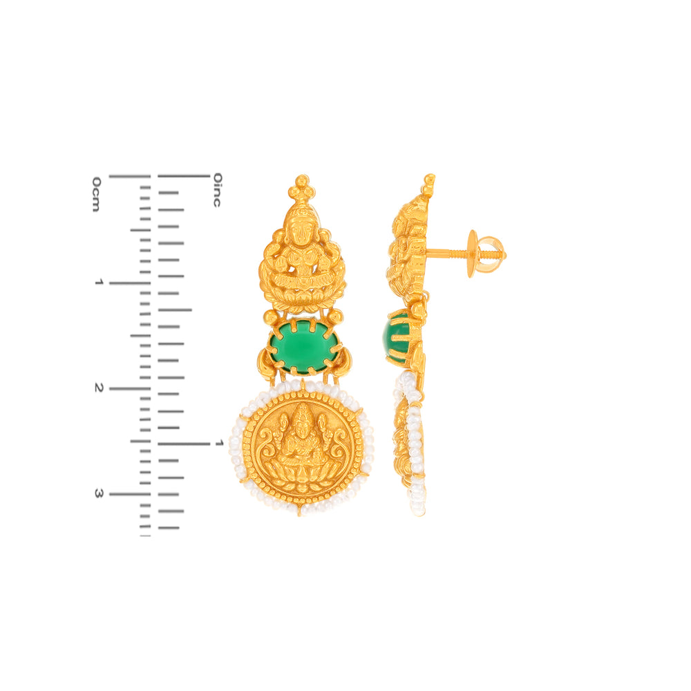 Introducing the Elegant Antique Patta Haaram by Malani Jeweler a stunning piece of craftsmanship designed specifically for women. This exquisite necklace set crafted in 22K gold showcases intricate Kundan work and vibrant gemstones epitomizing timeless elegance. As part of the Patta Sets category this piece carries a gross weight of 196.6 grams and holds a distinguished place in our collection of antique jewelry. The necklace features a length of 22 inches and a width of 1.16 inches with a pendant that measures 4.66 inches in length and 2.87 inches in width. Accompanied by earrings each 3.15 inches long and 1.71 inches wide secured with screw-back posts for added comfort and security. The set's antique finish adds to its regal allure making it a perfect choice for special occasions. Explore the beauty and heritage encapsulated in this Elegant Antique Patta Haaram an exquisite jewelry piece by Malani Jeweler designed to enhance your traditional ensemble.