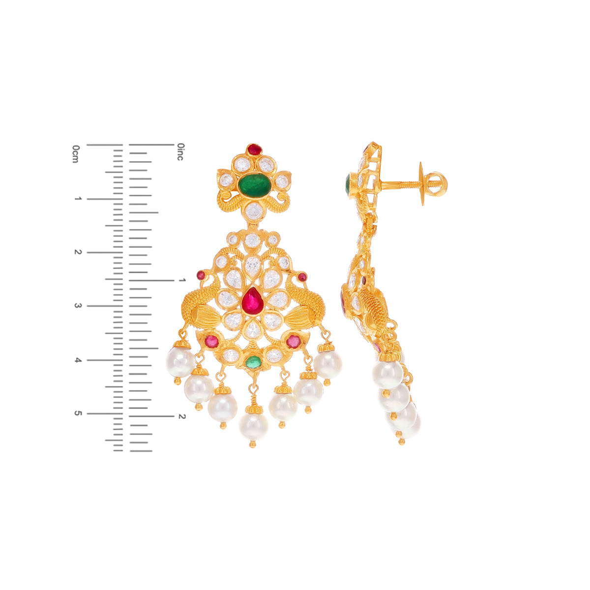 Introducing the Magnificent Antique Laxmi Patta Haaram by Malani Jeweler. This exquisite piece is crafted in 22K gold reflecting the elegance of traditional craftsmanship with a radiant antique finish. The set belongs to the women's Patta Sets category thoughtfully designed to enhance your neckline with its impressive 24-inch length and 0.55-inch width. This striking necklace features a pendant measuring 2.44 inches in length and 1.8 inches in width adorned with vibrant gemstones that capture attention. Complementing the necklace the earrings measure 2.12 inches in length and 1.02 inches wide featuring a secure screw back post type for comfort and ease of wear. With a gross weight of 92.8 grams this Patta Set embodies grandeur and heritage making it an ideal choice for special occasions. Embrace this luxurious masterpiece by Malani Jeweler and elevate your jewelry collection with its timeless beauty and cultural charm. Embrace allure and tradition with this stunning patta haaram.