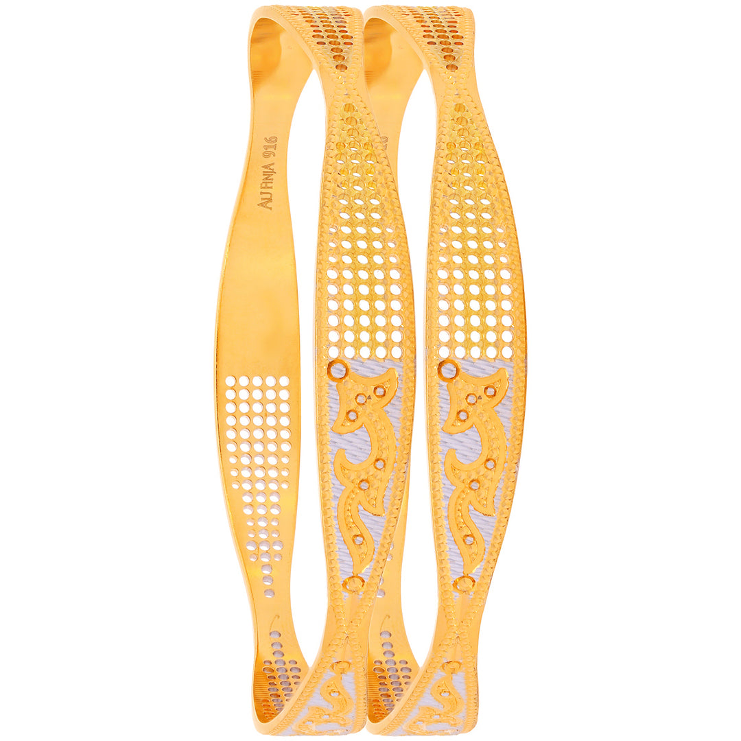 Introducing an exquisite set of bangles by Malani Jeweler perfect for women who appreciate timeless elegance. These 22K gold bangles SKU 49-08883 feature a unique two-tone finish that enhances their allure. Crafted meticulously these bangles belong to the "Women -> Bangles -> Set of Bangles" category reflecting traditional craftsmanship. With a gross weight of 36.3 grams and a bangle size of 2.7 they offer a perfect fit and a sophisticated look. The beautiful yellow hue adds a touch of luxury. Designed as a set of two these bangles encapsulate refined beauty and are ideal for various occasions. Enhance your jewelry collection with this captivating set by Malani Jeweler.