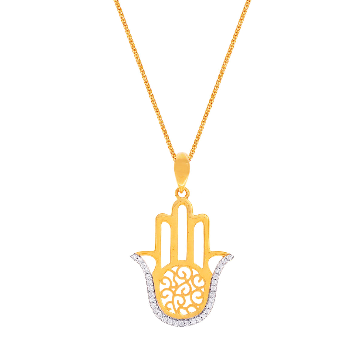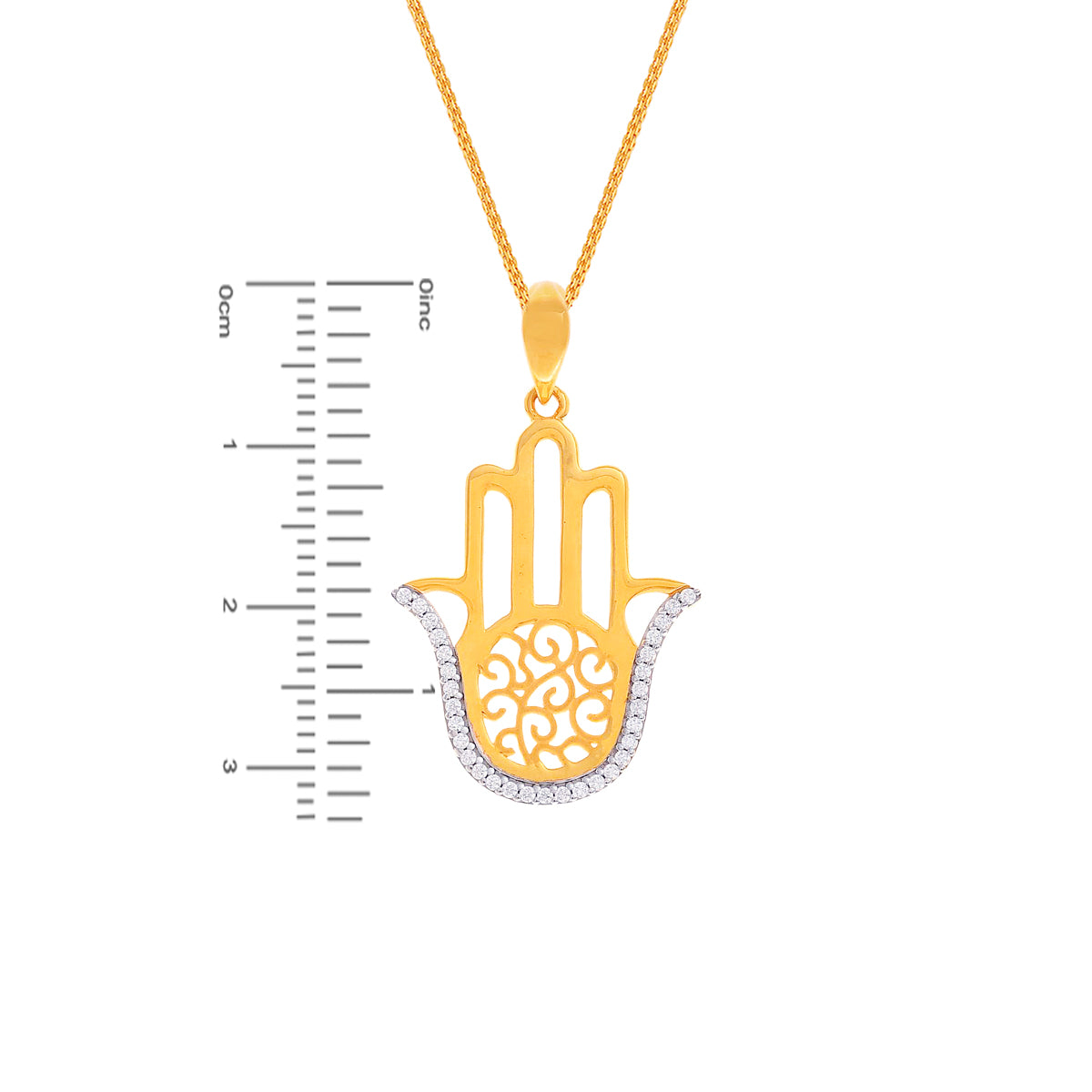 Discover elegance with the Ahisma Hand Pendant with CZ in 22K gold by Malani Jeweler. Crafted for women this pendant is an exquisite piece in our WOMEN->Necklaces->Pendants collection. Made from premium 22KT yellow gold the pendant reflects a classic charm. It measures a length of 1.29 inches and a width of 0.76 inches with a total weight of 2.2 grams. The yellow finish adds a timeless appeal perfect for any occasion. Elevate your style with this gold pendant and experience the allure of fine craftsmanship from Malani Jeweler. Ideal for searchers of quality gold jewelry this pendant is a testament to understated beauty. SKU: 95-10047.