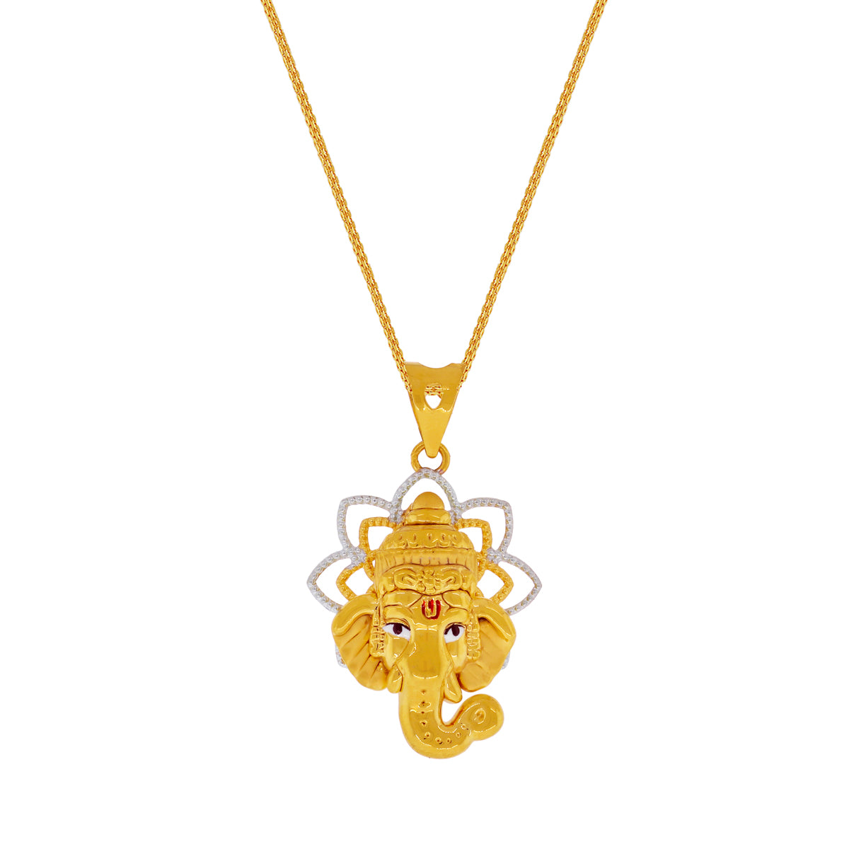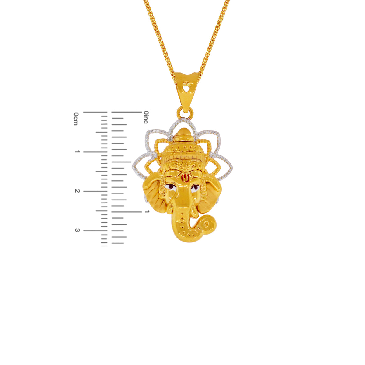 Discover the exquisite Ganesha Minakari Pendant in 22K Gold by Malani Jeweler a perfect blend of artistry and spirituality. This stunning piece falls under the category of women's necklaces and pendants though it's also a cherished accessory for men. Crafted in radiant 22KT gold the pendant showcases a vibrant minakari finish embodying the divine grace of Lord Ganesha. Measuring 1.37 inches in length and 0.79 inches in width this intricately designed pendant reflects unparalleled craftsmanship and weighs 2.8 grams offering an elegant balance between style and tradition. While the pendant is sold separately it allows for versatile pairing with your favorite chains. Emphasize your spiritual side with this captivating gold pendant in a rich yellow hue. Elevate your jewelry collection with Malani Jeweler's Ganesha Minakari Pendant a timeless piece that echoes your personal devotion and style. Note: No chain included GIACertified is false.