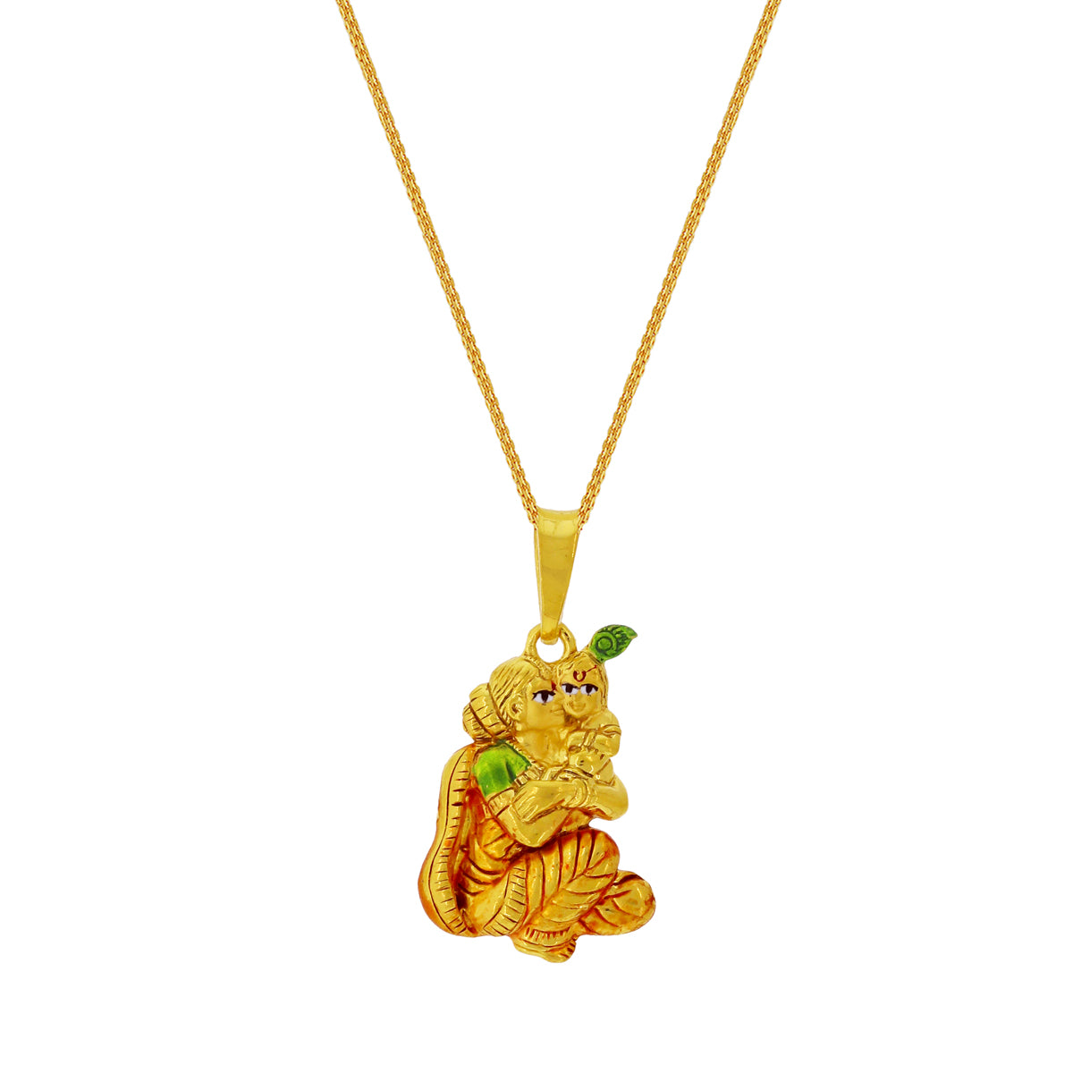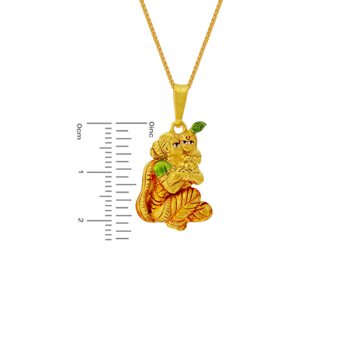 Introducing the exquisite Krishna Minakari Pendant in 22K Gold a stunning creation by Malani Jeweler. This beautiful piece is crafted with precision and artistry capturing the essence of traditional elegance. Designed for both women and men this unisex pendant is a timeless addition to any jewelry collection. The pendant features intricate Minakari work showcasing a vibrant fusion of colors against the rich yellow hue of 22KT gold. Measuring 0.99 inches in length and 0.51 inches in width this pendant offers the perfect balance of size and sophistication. It is lightweight and comfortable for everyday wear. Whether you're searching for a statement piece or a meaningful gift this Krishna Minakari Pendant is an ideal choice. Please note that a chain is not included in the price allowing you to personalize it with your own choice of chain. Shop Malani Jeweler for this unique pendant that stands out in the pendants category and enhance your elegance effortlessly.