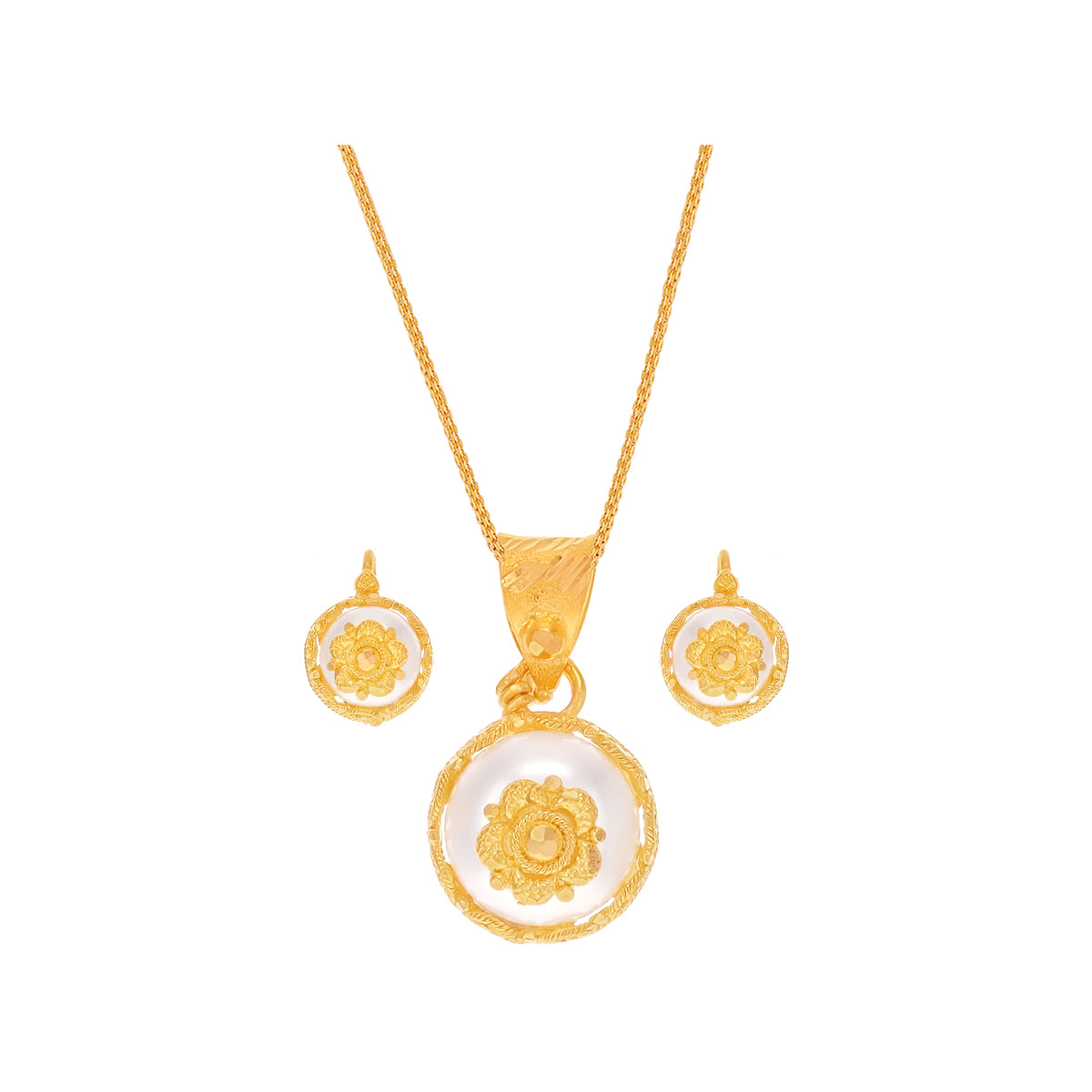 Explore the elegance of our 22K Gold Pendant Set by Malani Jeweler. Designed for women this captivating yellow gold set features a pendant and earrings all crafted with precision. The pendant measures 0.8 inches in length and 0.43 inches in width perfectly complementing any attire. The set includes earrings with a fish hook post each with a length of 0.53 inches and a width of 0.36 inches. With a style gross weight of 6.7 grams this pendant set is ideal for adding a touch of sophistication. Perfect for those seeking elegant and timeless jewelry pieces. Enhance your collection with this exquisite gold jewelry by Malani Jeweler.
