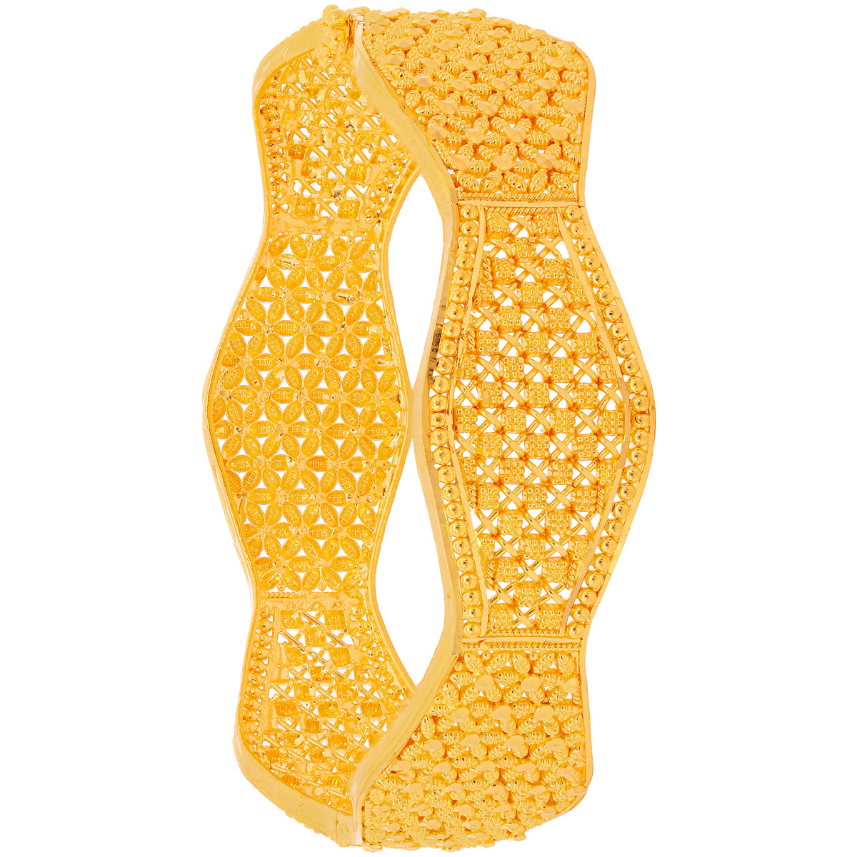 Introducing the Brilliant 2pcs Kara in 22K Gold by Malani Jeweler. Designed for women who appreciate elegance these exquisite bangles are crafted from premium 22-karat gold. The bangles feature a stunning yellow finish embodying timeless style. Each bangle measures 2.5 inches in size with a width of 0.68 inches and is easily adjustable up to 2.7 inches for the perfect fit. The open-able design featuring a secure screw or clip on the side or top ensures a seamless wearing experience. With a style gross weight of 49.5 these karas reflect both luxury and craftsmanship. Elevate your jewelry collection with this impeccable piece from Malani Jeweler. Ideal for search engine visibility this detailed description highlights the key features and dimensions that make these bangles a must-have accessory. SKU Code: 46-15686.