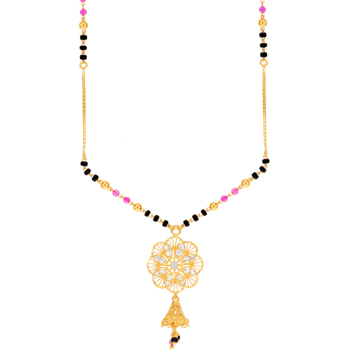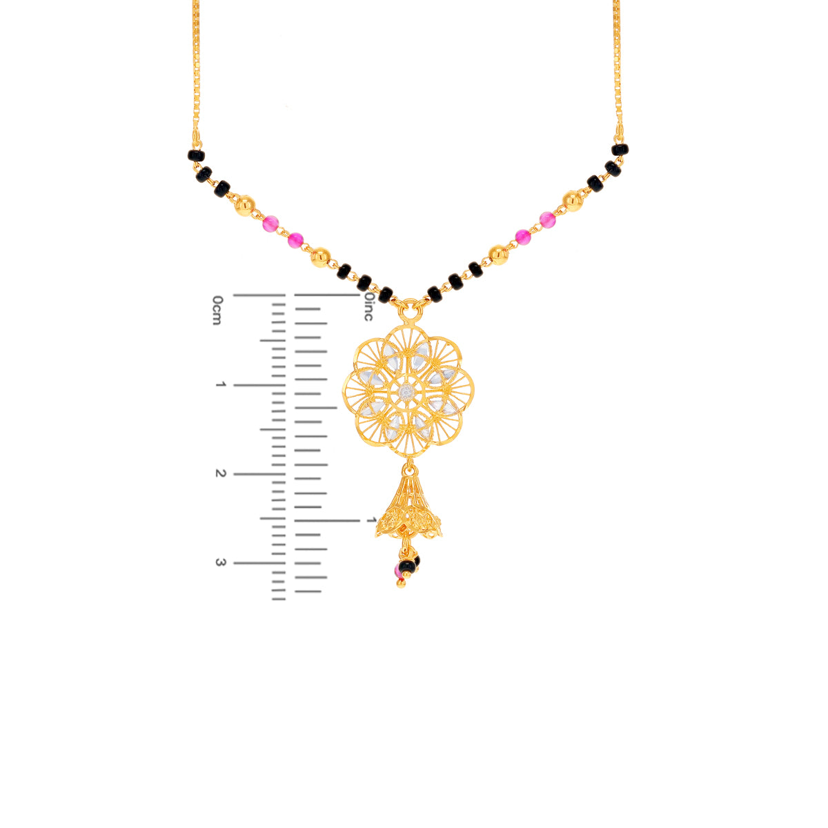 Discover the allure of tradition with the exquisite Two-Tone Mangalsutra by Malani Jeweler masterfully crafted in 22K Gold. This captivating piece of jewelry is a quintessential addition to any woman's collection reflecting a harmonious blend of elegance and cultural heritage. Designed for the modern woman the mangalsutra features a striking two-tone finish that enhances its timeless appeal. Measuring a delicate 16 inches in length and 0.1 inches in width this luxurious piece gracefully adorns the neckline. The centerpiece of this necklace is a beautifully crafted pendant measuring 1.38 inches in length and 0.63 inches in width a perfect focal point that accentuates its refined design. Weighing in at a gross weight of 7 grams this mangalsutra is both lightweight and durable ensuring comfort for everyday wear. The vibrant yellow gold melded with modern styling makes it an ideal piece for weddings anniversaries or everyday elegance. Elevate your jewelry collection with Malani Jeweler’s Two-Tone Mangalsutra—a perfect symbol of love and commitment embodying a seamless blend of tradition and modernity.