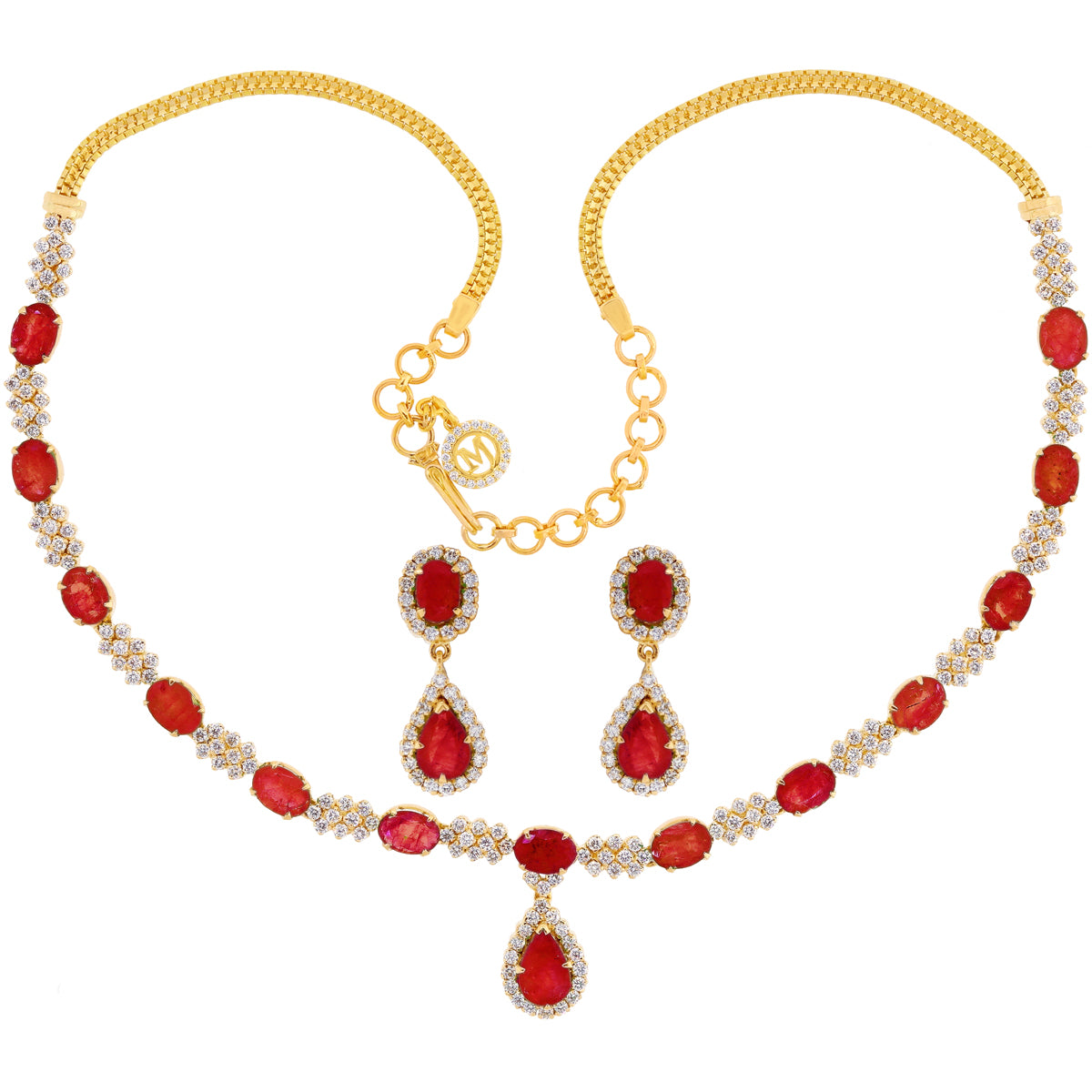 Discover elegance with Malani Jeweler's exquisite 3.96Ct VS/GH Diamond Necklace Set with Ruby SKUCode: 321-01311. Crafted for women this stunning set belongs to the Necklace Sets category featuring a harmonious blend of diamonds and rubies. The necklace glows in 18KT yellow gold with a style gross weight of 32.2 grams. It showcases 213 white diamonds with a total weight of 3.96 carats exhibiting VS clarity and G-H color. The rubies have a total gemstone weight of 11.0 carats adding vibrant allure. The set includes screw-back earrings for secure wear. This captivating piece by Malani Jeweler blends classic beauty with modern design making it a perfect choice for any occasion.