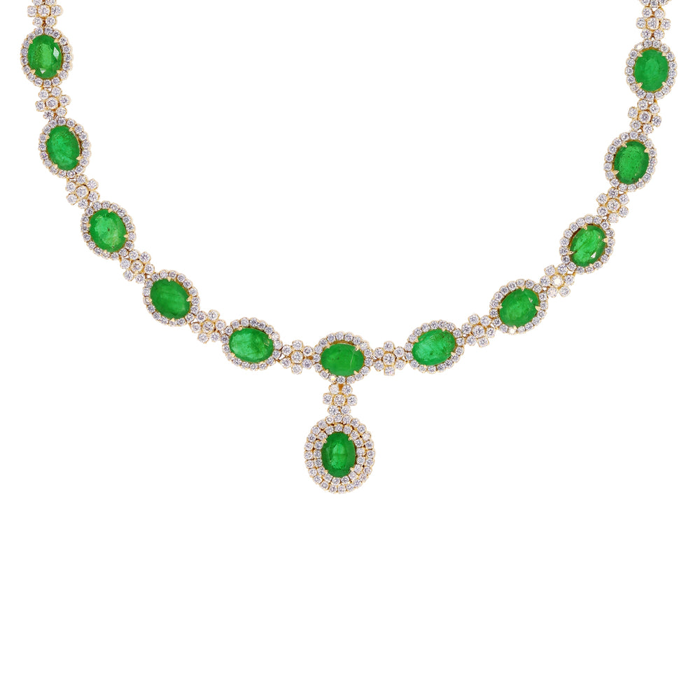 Introducing the exquisite 6.99Ct VS/GH Diamond Necklace Set with Emerald by Malani Jeweler. Crafted in lustrous 18K yellow gold this elegant set is designed for women who appreciate timeless beauty. The necklace and earring ensemble features 501 white diamonds with a total weight of 6.99 carats boasting VS clarity and G-H color. Adding a vivid contrast the set is adorned with emerald gemstones weighing 23 carats. The necklace set includes earrings with a secure screw back post. With a gross weight of 45.9 grams this piece combines luxury with sophistication. Ideal for any special occasion this necklace set sits within the Women's Necklace Sets category perfect for those searching for high-quality diamond jewelry. Explore the world of fine jewelry with Malani Jeweler and elevate your style with this remarkable set.