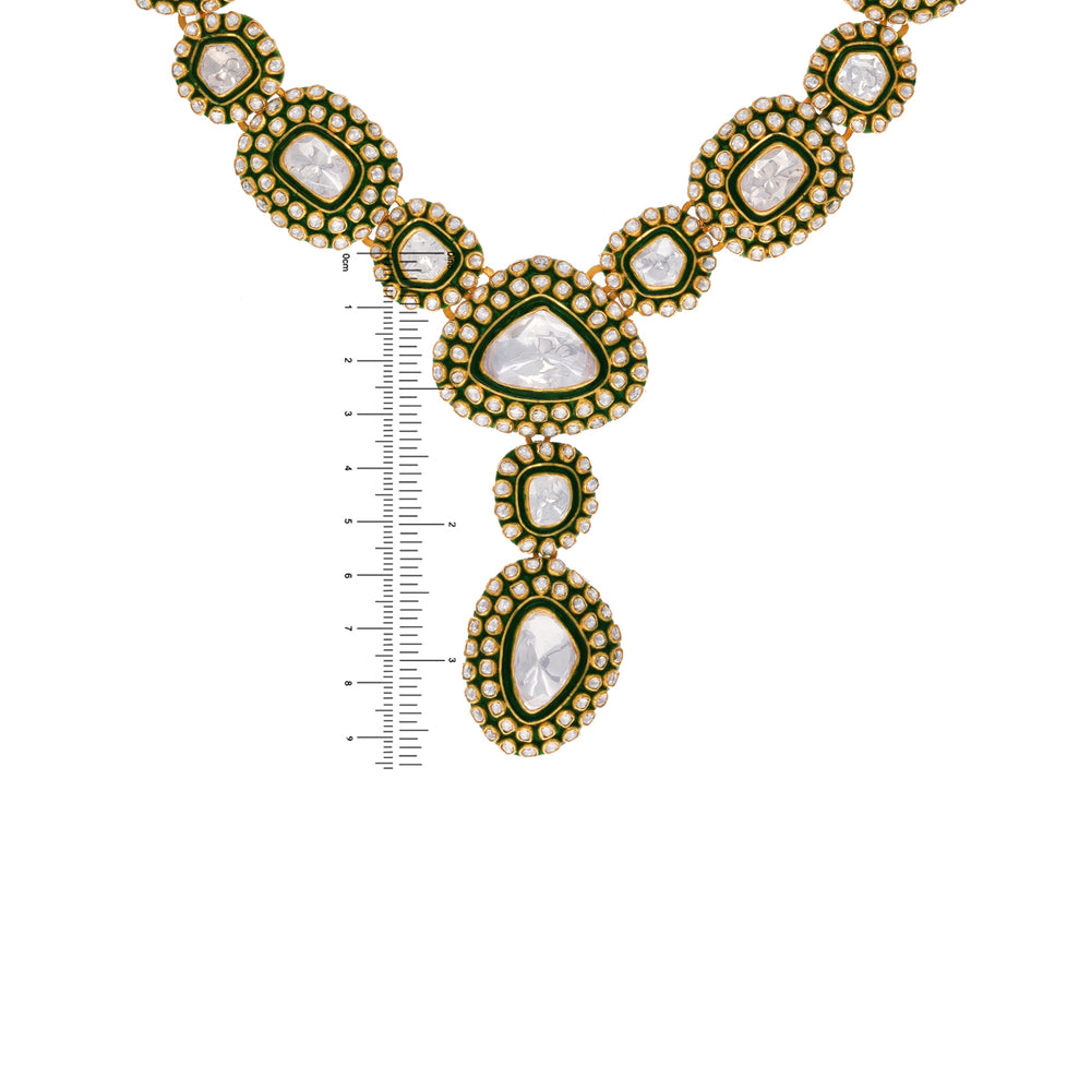 Explore timeless elegance with the Attractive Antique Necklace Set by Malani Jeweler crafted in 22K gold. This exquisite necklace set features Kundan and gemstones offering a classic antique finish. The necklace measures 18 inches in length and 1.03 inches in width complemented by a pendant that is 3.65 inches long and 1.57 inches wide. The set includes earrings with a length of 2.22 inches and a width of 1.06 inches featuring a secure screw back post type. This distinguished jewelry piece for women falls under the necklace sets category SKU Code: 10-00395. Perfect for women seeking a unique touch this antique-style set provides a sophisticated allure designed to enhance any ensemble. Discover this elegant piece at Malani Jeweler and embrace its refined charm.