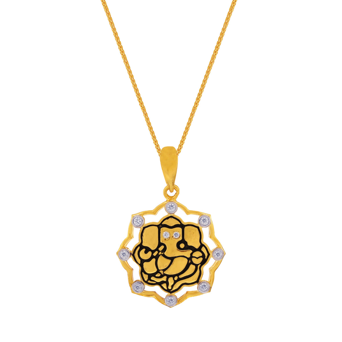 Elevate your jewelry collection with the exquisite Ganesha Minakari Pendant by Malani Jeweler. Crafted in lustrous 22K gold this unisex pendant showcases intricate Minakari detailing embodying the divine presence of Ganesha with contemporary elegance. Measuring 1.06 inches in length and 0.71 inches in width this elegant piece is adorned with sparkling CZ stones adding a touch of refined luxury to any outfit. This handcrafted pendant ensures a lasting impression. Perfect for both men and women the vibrant yellow gold finish highlights the artistry and tradition of Malani Jeweler. Please note this item is sold without a chain. Ideal for gifting or a personal treat this pendant is categorized under women's necklaces and pendants yet its design transcends traditional gender boundaries. A must-have accessory for those who appreciate fine craftsmanship and spiritual symbolism make it a focal point in your jewelry ensemble today.