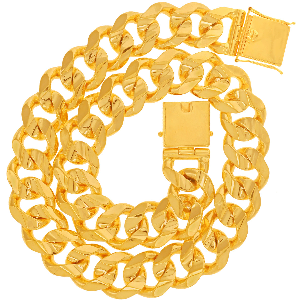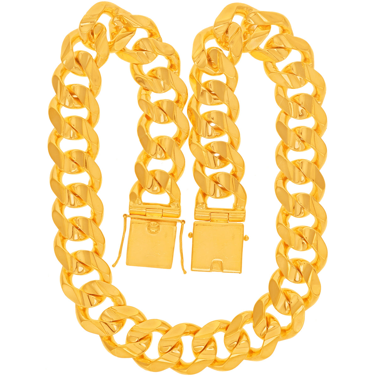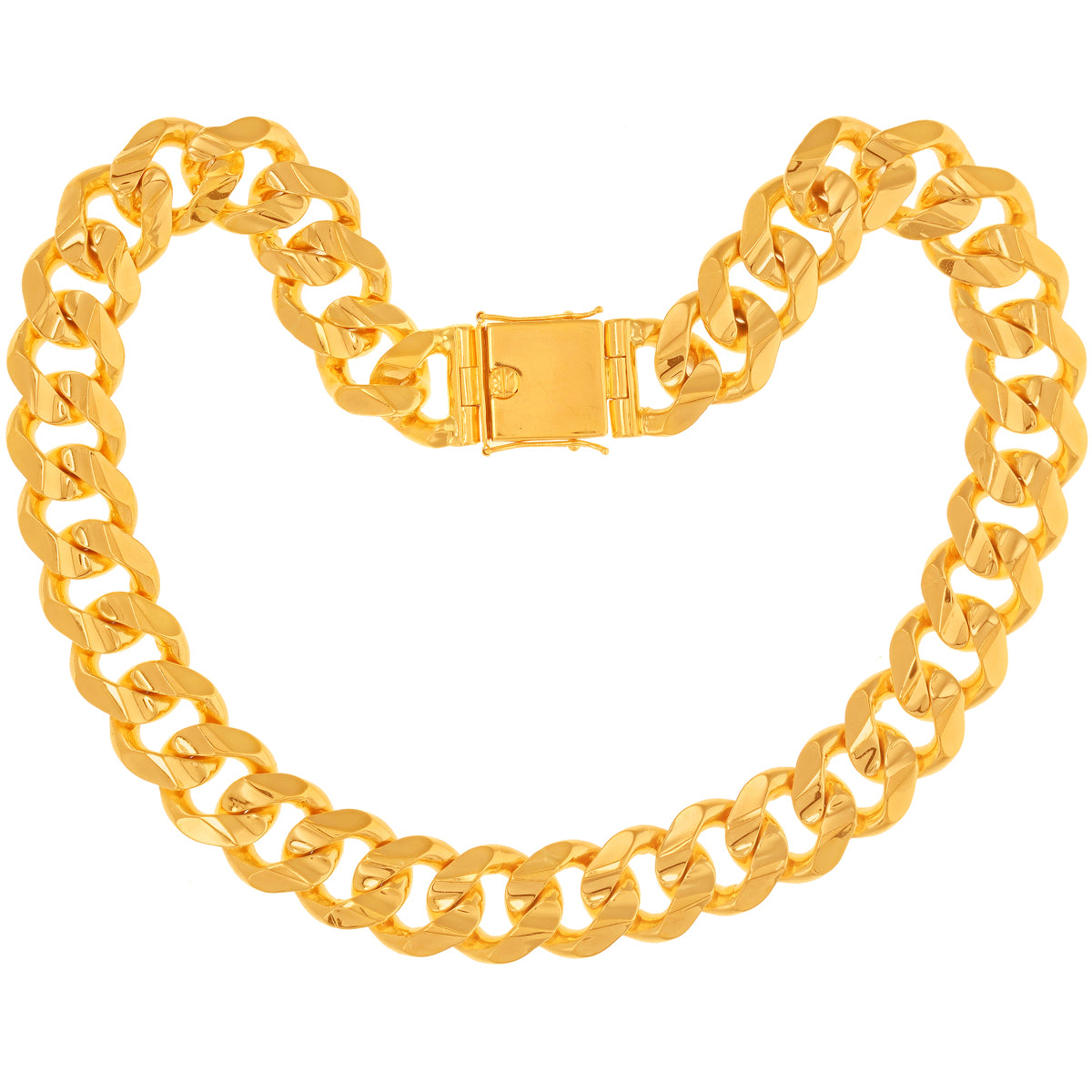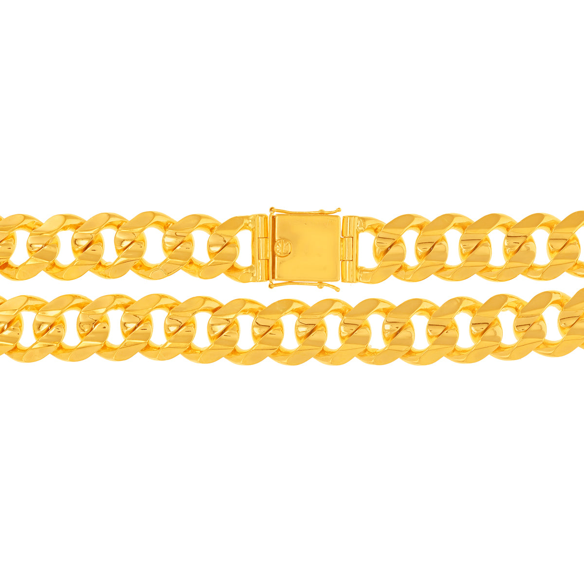 Introducing the Malani Jeweler Cuban Link 24" Chain in 22K Gold a striking piece from our men's fancy chains collection. This exquisite necklace crafted for men highlights the luxurious appeal of 22KT yellow gold. Measuring 24 inches in length and 1.21 inches in width it is designed for a substantial and bold look. The chain boasts a gross weight of 1203.4 grams offering a substantial presence and timeless elegance. Perfect for adding sophistication to any attire this Cuban link chain reflects craftsmanship and style. Ideal for those seeking a centerpiece accessory this yellow gold masterpiece embodies the premium quality associated with Malani Jeweler. Explore its appeal in our exclusive men's necklaces collection.