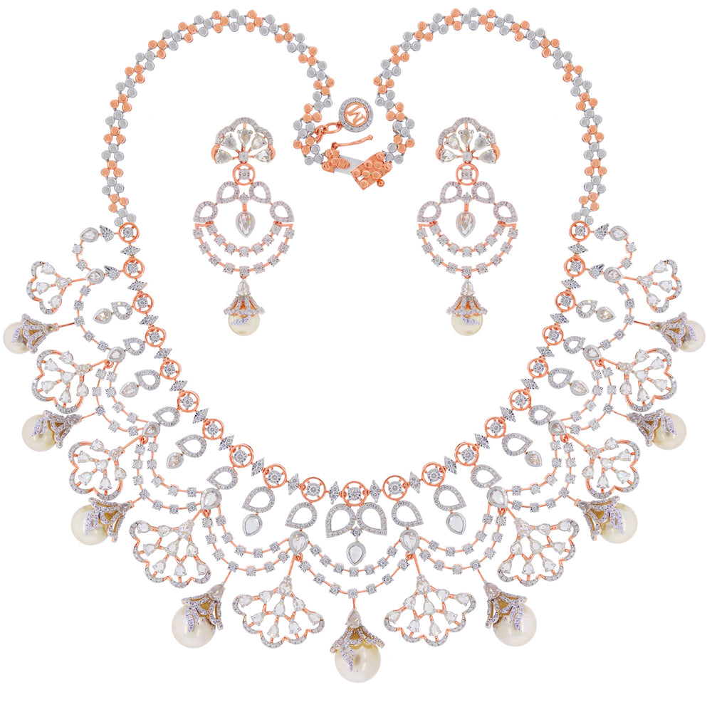 14.93Ct VVS/FG White Diamond & Rose Cut Diamond Necklace Set in 18K Rose Gold