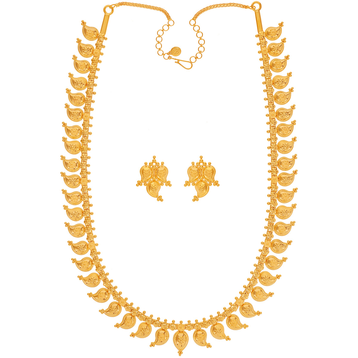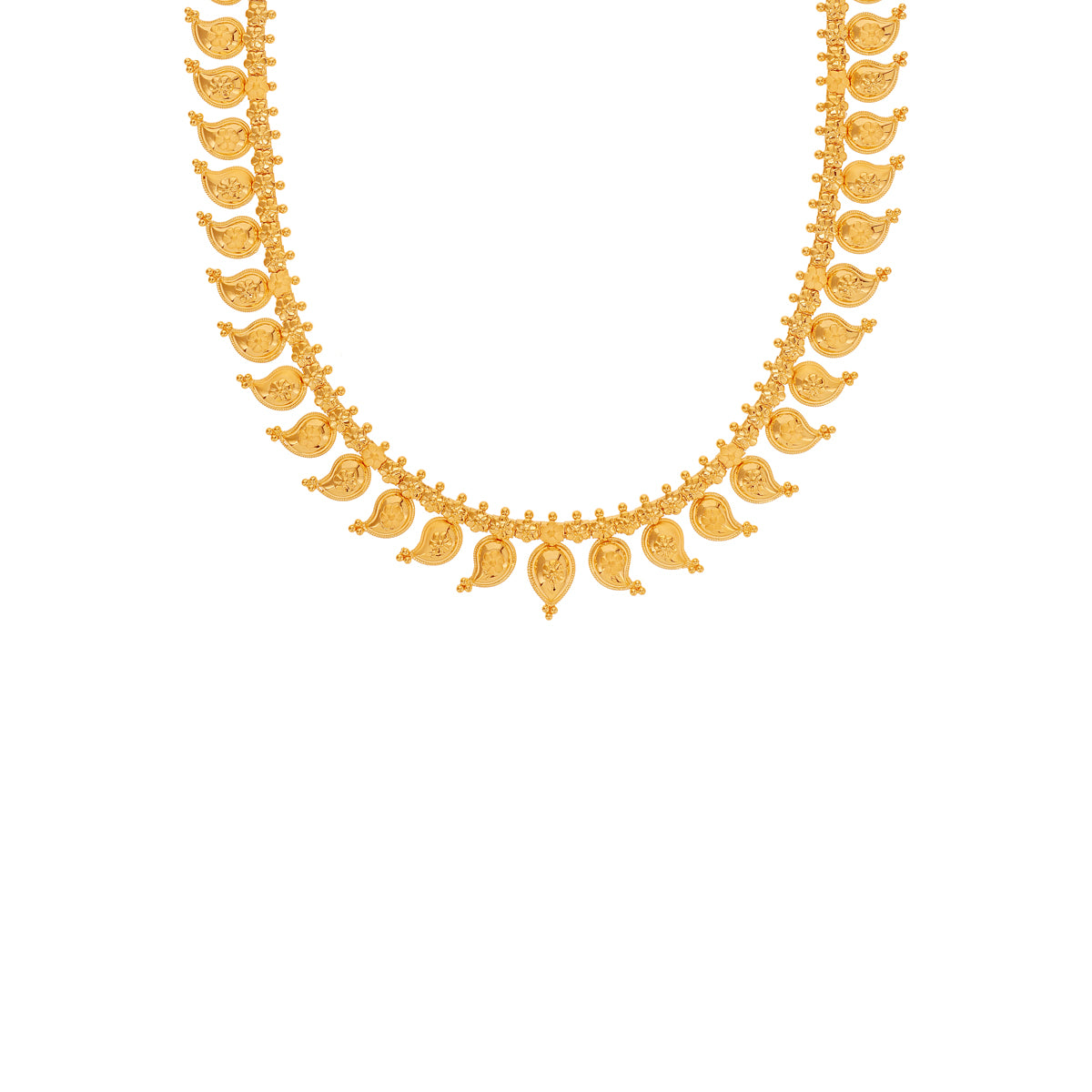 Introducing the Classic Mango Patta Haaram by Malani Jewelers a stunning piece of craftsmanship in 22KT gold that embodies timeless elegance and opulence. Perfectly designed for women. Its rich yellow finish perfectly highlights the luxurious gold luster making it a captivating addition to any wardrobe. The necklace at a generous length of 24 inches and a width of 0.86 inches drapes beautifully around the neckline ensuring a graceful and sophisticated appearance. Complementing the necklace are intricately designed earrings measuring 1.16 inches in length and 0.89 inches in width secured with comfortable screw backs. This set showcases a stunning mango design adding a touch of traditional charm perfect for special occasions or everyday elegance. This exquisite mango Patta Haaram promises unmatched beauty and quality. Experience the allure and luxury of the Classic Mango Patta Haaram by Malani Jewelers a timeless investment that enhances your style and leaves a lasting impression.
