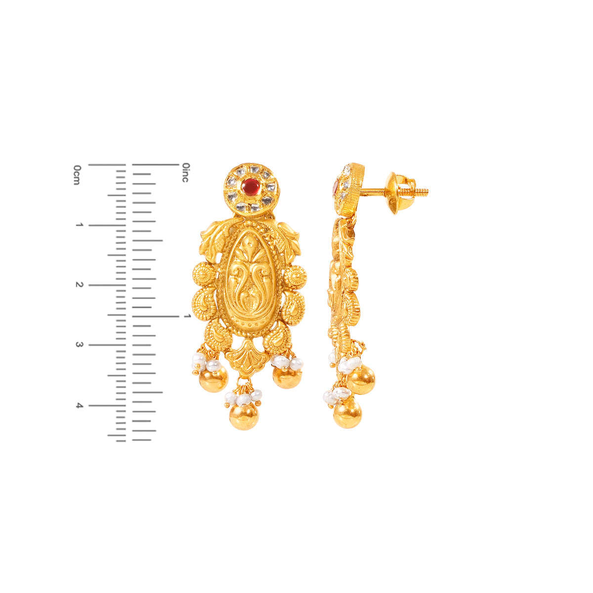 Discover the exquisite charm of the Enchanting Antique Necklace Set by Malani Jeweler crafted in 22K gold. This set features intricate Kundan and gemstones designed for women who appreciate timeless elegance. The necklace measuring 16 inches in length and 0.72 inches in width boasts a striking pendant with dimensions of 2.56 inches in length and 1.58 inches in width. Complementing the necklace are earrings with a length of 1.68 inches and a width of 0.73 inches secured with a screw-back post. With a gross weight of 40.3 grams this antique-finish set merges tradition and sophistication. Perfect for those who seek a distinctive addition to their jewelry collection.