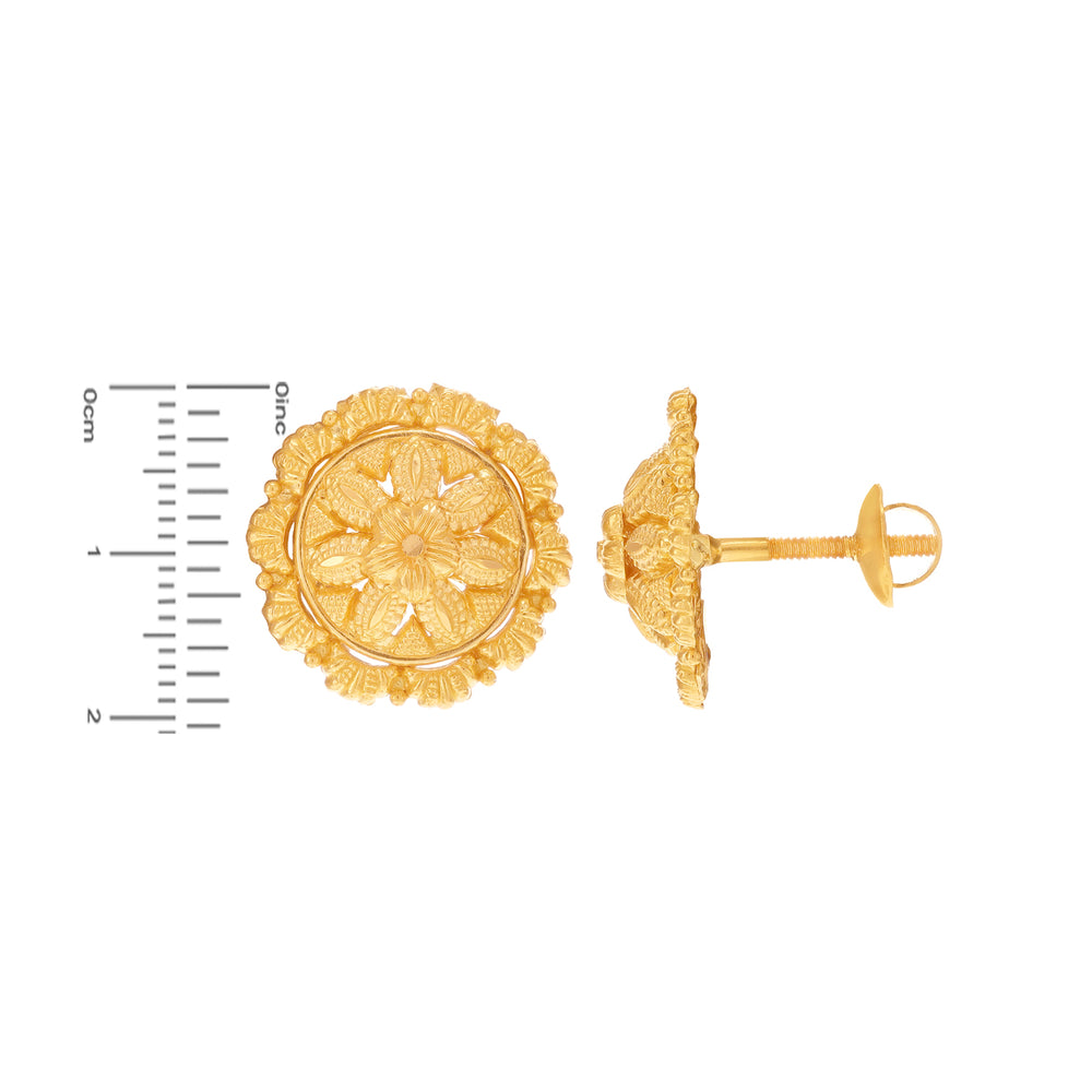 Introducing the exquisite 22K Gold Intricate Earrings by Malani Jeweler SKU 80-21581. These beautifully crafted earrings are designed for women who appreciate elegance and sophistication. Expertly made in 22KT gold these yellow finish tops are a stunning addition to any jewelry collection. Each earring measures 0.71 inches in length and width providing a delicate yet striking look. The screw back post ensures secure wear combining style and practicality. With a style gross weight of 5.7 these gold earrings are perfect for any occasion. Enhance your jewelry ensemble with these remarkable gold tops by Malani Jeweler.