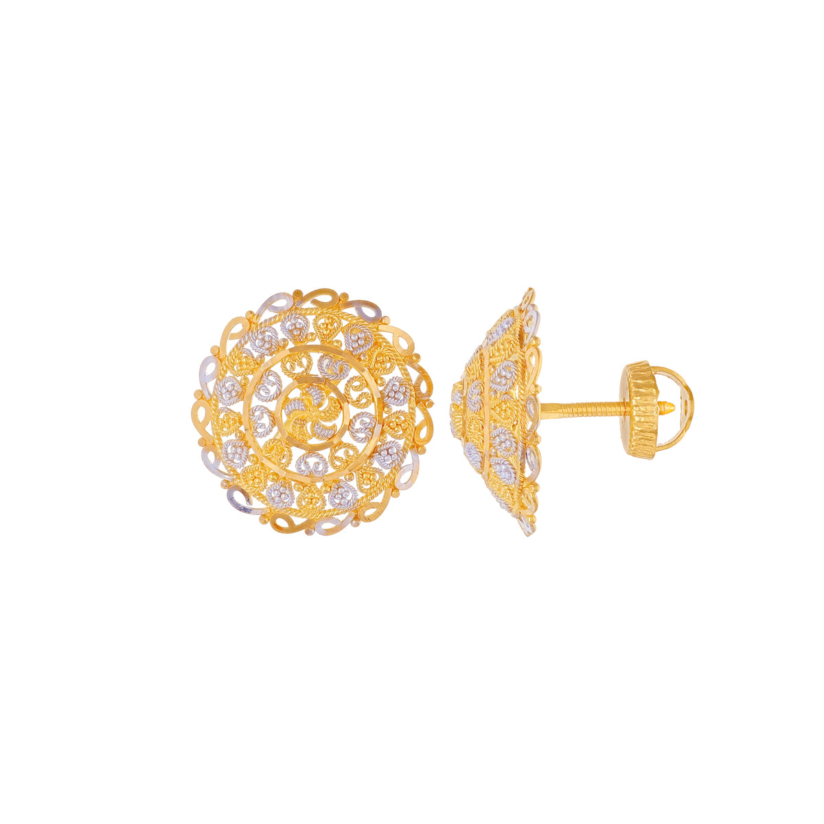 Discover the elegance of Malani Jeweler's Mesmerizing Two Tone Earrings in 22K Gold SKU Code: 80-20835. Designed for women these striking earrings belong to our WOMEN -> Earrings -> Tops category. Crafted with 22KT gold they feature a two-tone finish. Each earring measures 0.79 inches in both length and width perfectly balanced for a comfortable wear. The style gross weight is 7.6 offering a substantial feel. Equipped with a secure screw back these gold earrings are ideal for versatile styling. Enhance your jewelry collection with this standout piece from Malani Jeweler masterfully blending tradition and modernity.
