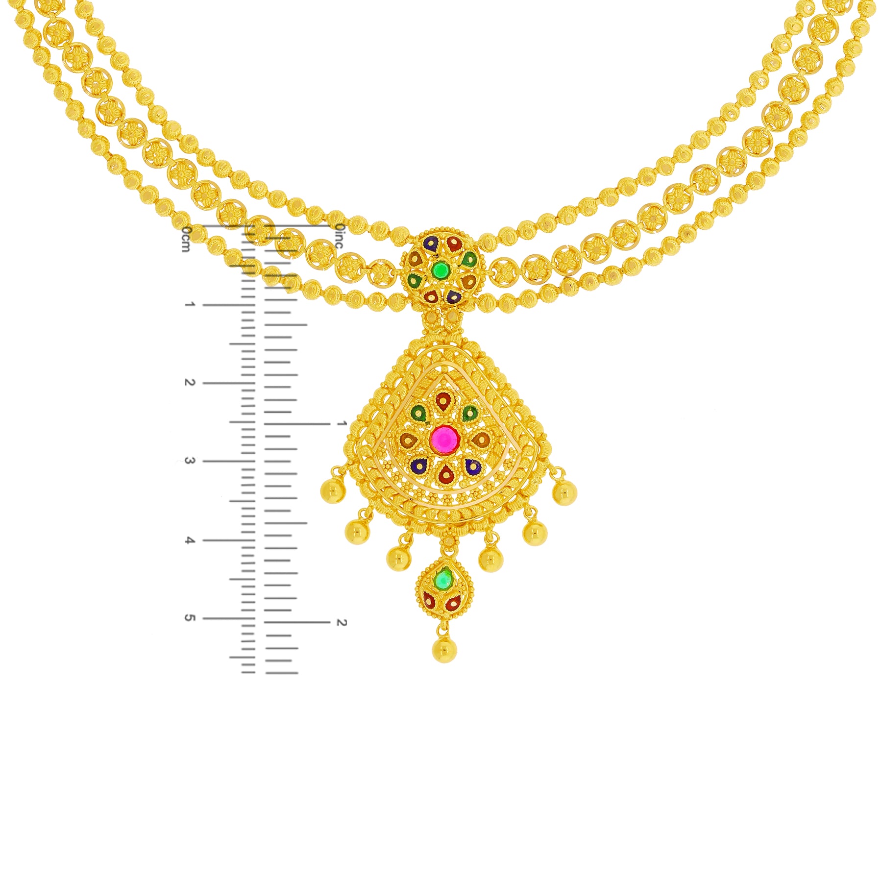 Discover the exquisite 22K Gold Minakari Necklace Set by Malani Jeweler crafted for women who appreciate timeless elegance. This stunning set includes a necklace pendant and earrings each adorned with intricate Minakari detailing and vibrant gemstones. The necklace measures 16 inches in length and 0.4 inches in width complementing any neckline with elegance. The pendant stands out at 2.4 inches long and 1.2 inches wide while the earrings offer a delicate touch with dimensions of 1.9 inches length and 0.78 inches width featuring screw-back posts for secure wear. With a gross weight of 42.4 grams this set combines luxurious design and comfort perfect for enhancing your collection. Explore the intricate beauty of this Minakari necklace set exclusively at Malani Jeweler where tradition meets contemporary style.