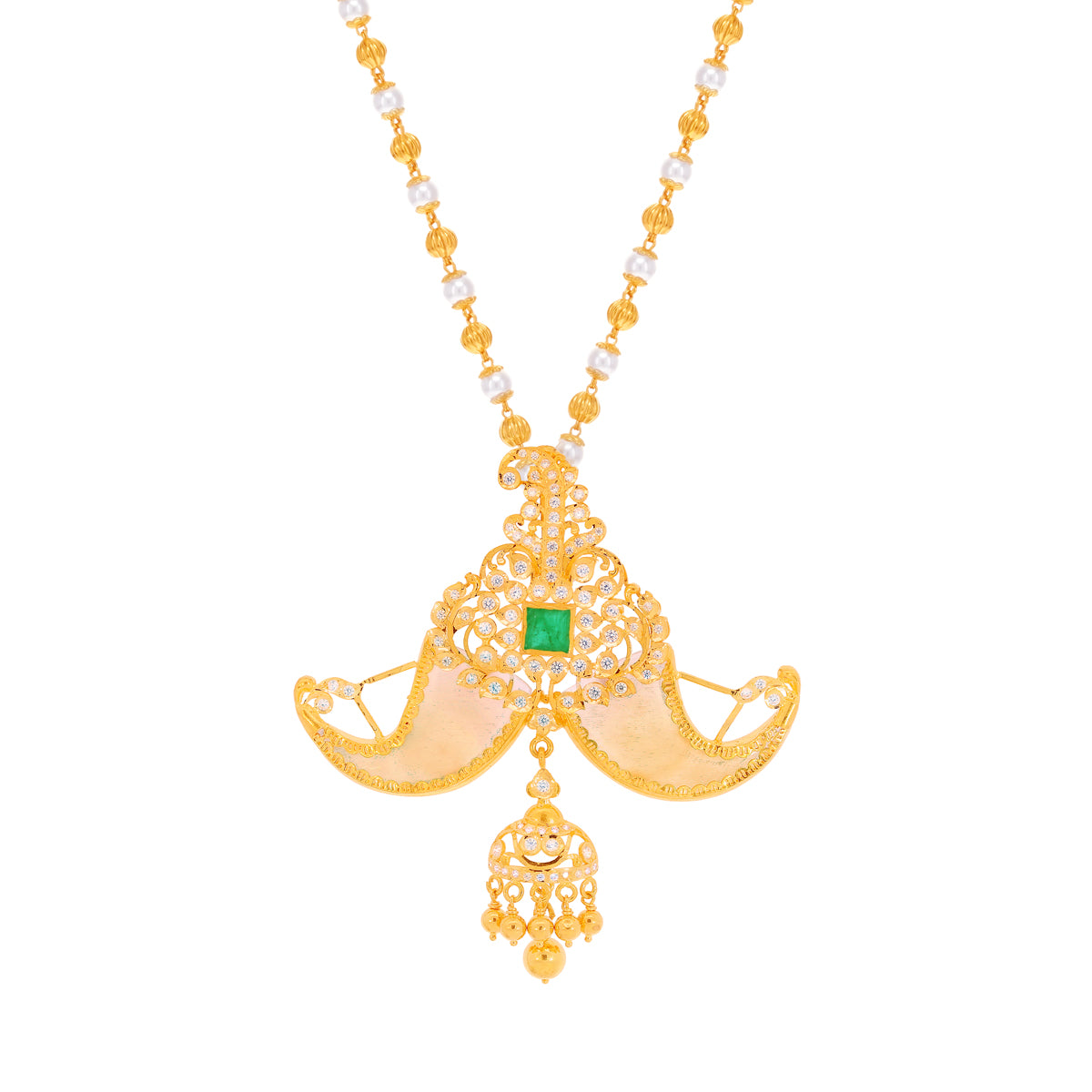 The Malani Jeweler Nail Pendant with Emerald & CZ in 22K Gold offers a stunning accessory for women. Featuring a beautiful yellow finish this pendant is crafted with 22KT gold. It measures 2.77 inches in length and 2.64 inches in width with a style gross weight of 20.4 grams. Designed for those who appreciate timeless elegance the pendant falls under the category hierarchy of WOMEN->Necklaces->Pendants. Its exquisite gemstones make it a standout piece in the pendants category. Although it is not GIACertified the craftsmanship remains unparalleled. SKUCode: 23-04814.